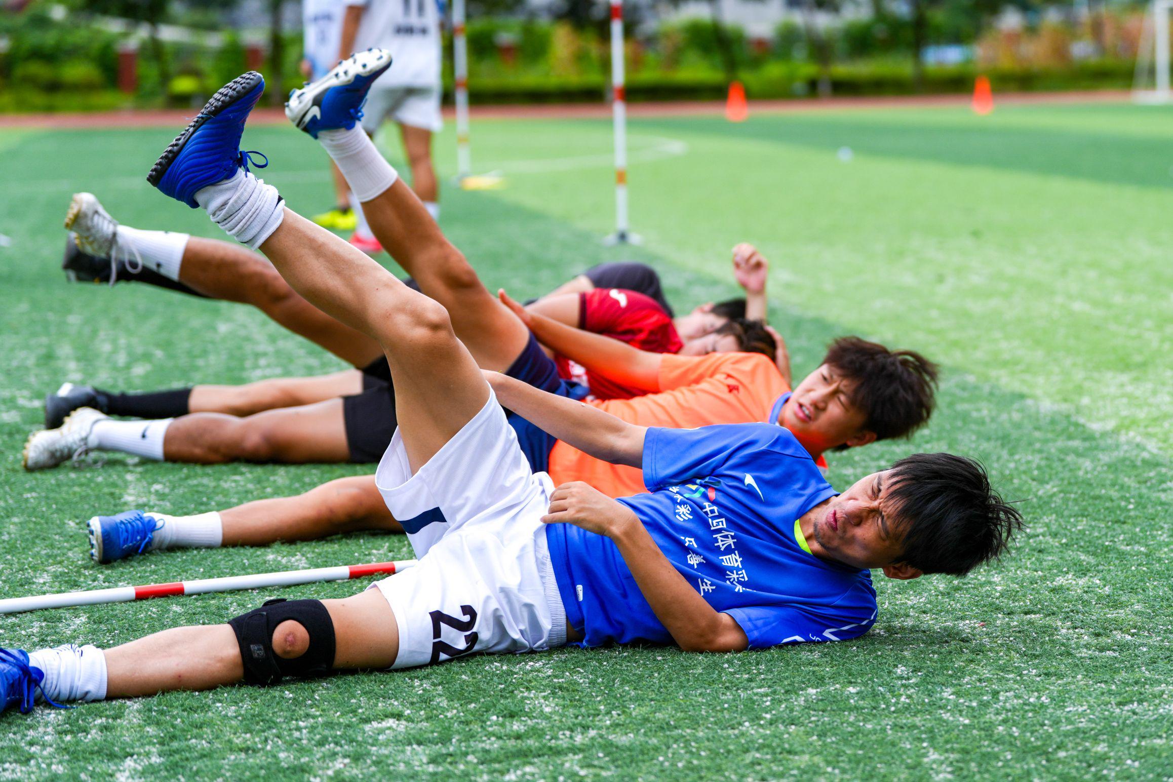 △8月14日,“湘超”湘西州足球代表队在州溶江中学足球场上进行体能训练。 图/杨贤清