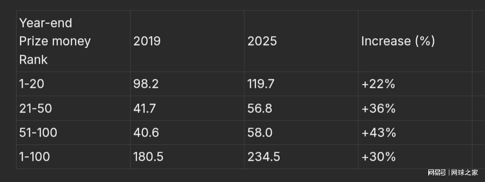 对排名较低的球员而言,情况则有所不同。排名21至50位的球员收入增长了36%;排名51至100位的球员增长了43%。这些群体的收入增幅跑赢了通胀,2025年的收入高于六年前。
